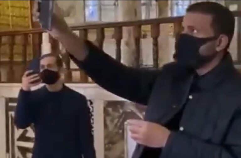 وأظهر المقطع المتداول والذي تسبب بغضب الفلسطينيين، الوفد الإماراتي أثناء التقاط أعضائه الصور داخل الجامع القبلي.
