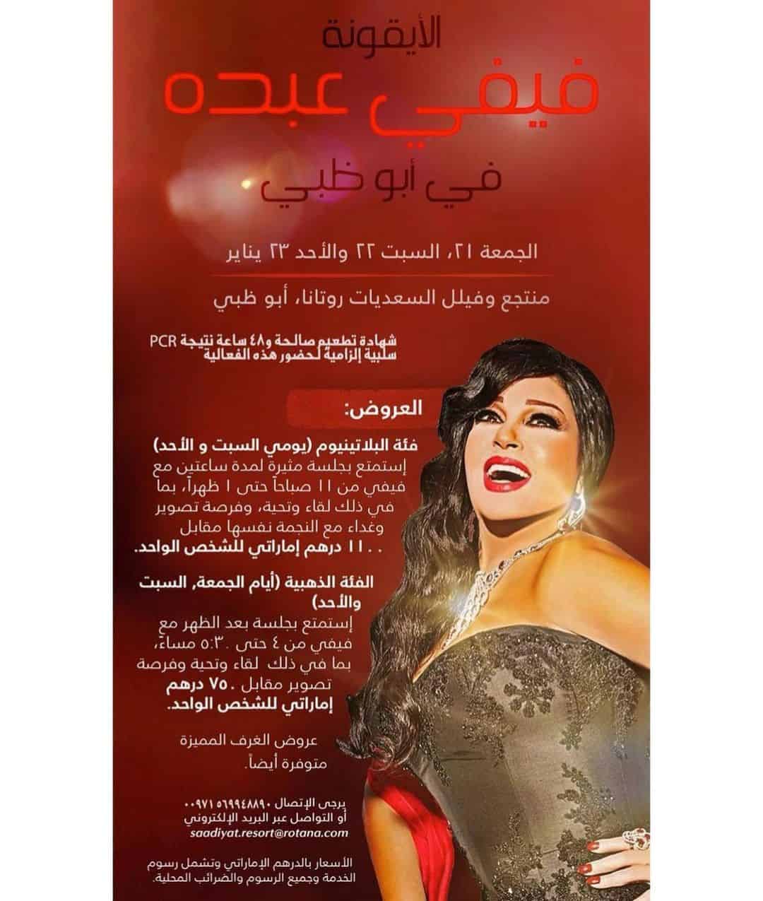 ونشرت فيفي عبده عبر حسابها على “انستجرام”، صورة توضح تفاصيل الأسعار للراغبين في لقاءها في الإمارات من 21 إلى 23 يناير الجاري.