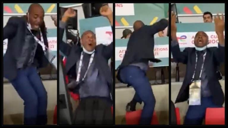 وأظهر مقطع الفيديو المتداول الفرحة الهستيرية للمعلق الرياضي من دولة غينيا الاستوائية داخل مدرجات المعلقين والوقوف على الكرسي للاحتفال بالفوز التاريخي، على منتخب الجزائر “محاربو الصحراء”، قبل أن يخرج خارج غرفة المعلقين المتواجدة في أرضية الملعب.