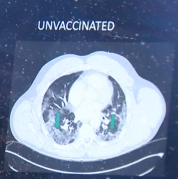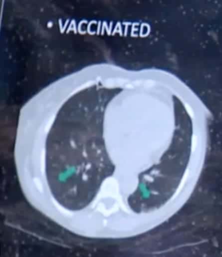 وعرض الدكتور أوان صوراً بالأشعة المقطعية لمريض كوفيد تم تطعيمه وصوراً تظهر تلفاً في رئة مريض غير ملقح.