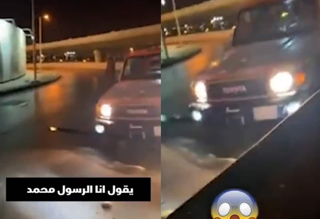 وظهر المواطن وهو يهاجم المارة ويمنعهم من المرور في الشارع الذي يقف، مدعيا أنه “الرسول محمد”.