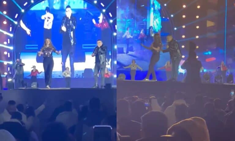 وفي أحد المقاطع، ظهرت فتاة ترقص مع عمر كمال على المسرح، وهو يغني أغنيته الشهيرة “بنت الجيران”، ووجه حديثه للجمهور قائلاً: “اللى مراحشى السعودية وغنا .. مشافش دلع و أتهنا”.