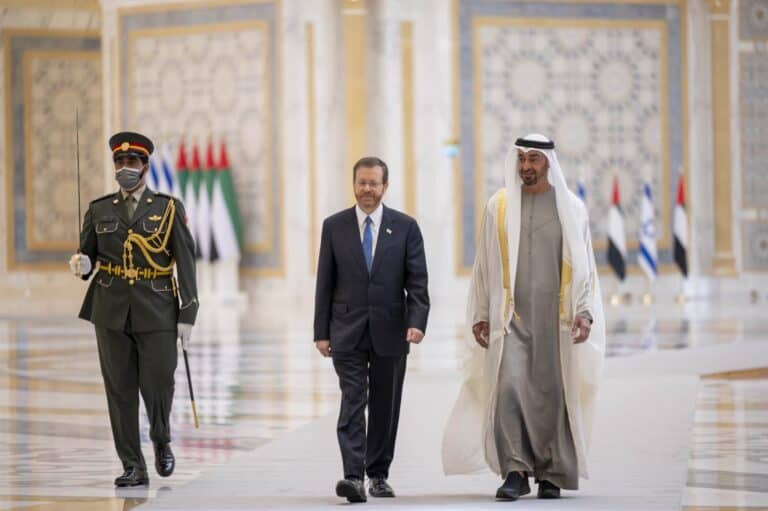 التقيت اليوم في أبوظبي، فخامة إسحاق هرتسوغ رئيس إسرائيل..ناقشنا العلاقات الثنائية وأهمية الاستفادة من الفرص المتنوعة في البلدين لتعزيز هذه العلاقات في ظل الرغبة المشتركة في بناء جسور التعاون والصداقة .. إضافة إلى مجمل القضايا الإقليمية محل الاهتمام المشترك pic.twitter.com/V25OMRCHqz