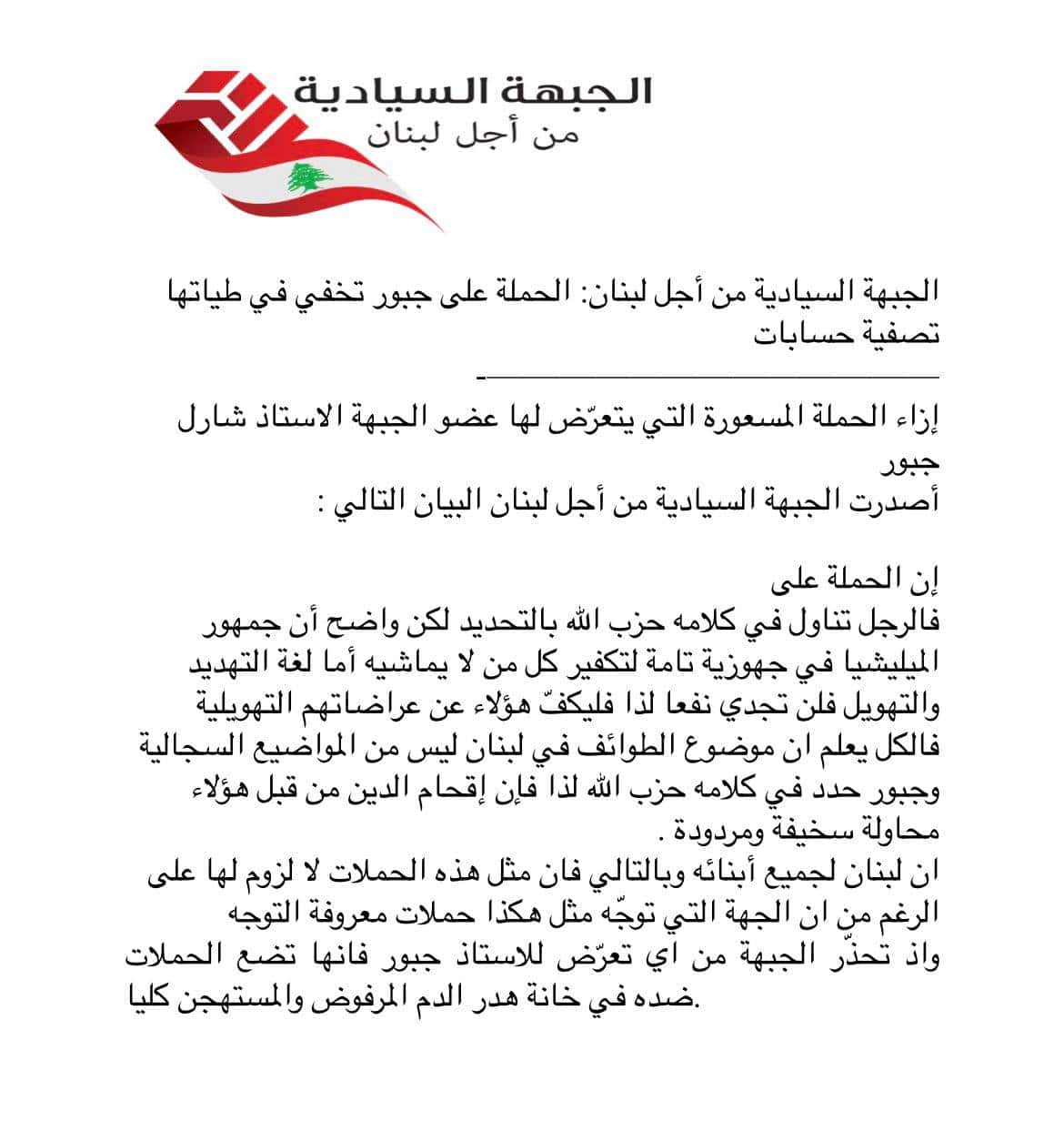 ومن جهتها قالت “الجبهة السيادية من اجل لبنان “إن الحملة التي يتعرّض لها عضو الجبهة السيادية الاستاذ شارل جبور تخفي في طياتها تصفية حسابات!. وعليه، أصدرت الجبهة بياناً تحذّر من أي تعرض للأستاذ جبّور وتضع الحملات ضده في خانة هدر الدم المرفوض والمستهجن كلياً!