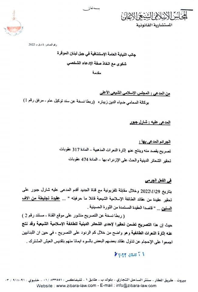 وطن – تقدم المجلس الإسلامي الشيعي الأعلى بشكوى مع اتخاذ صفة الادعاء الشخصي بحق رئيس جهاز الإعلام والتواصل في حزب القوّات اللُّبنانيِّة شارل جبور، بجرمي تحقير الشعائر الدينية وإثارة النعرات المذهبية.