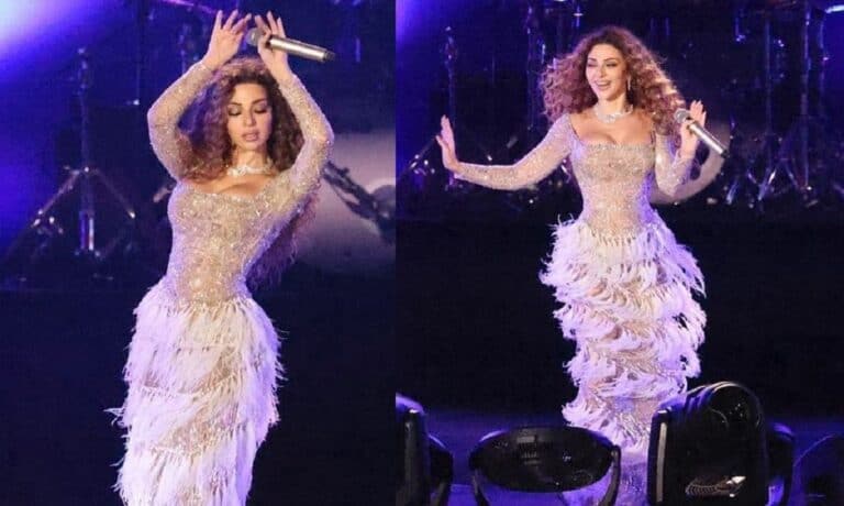وظهرت ميريام فارس خلال حفلها على مسرح ساحة اليوبيل في “إكسبو 2020 دبي”، بفستان جريء جدا مكشوف الصدر، وجسد جسمها بشكل فاضح.
