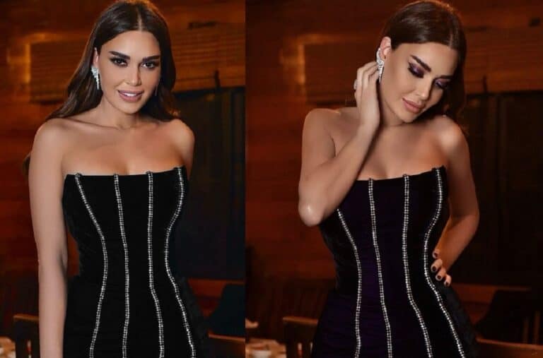 وارتدت سيرين، فستاناً أسود أوف شولدر بتصميم ضيق، مطرزاً بخيوط فضية، ومكشوف الظهر بشكل كبير.