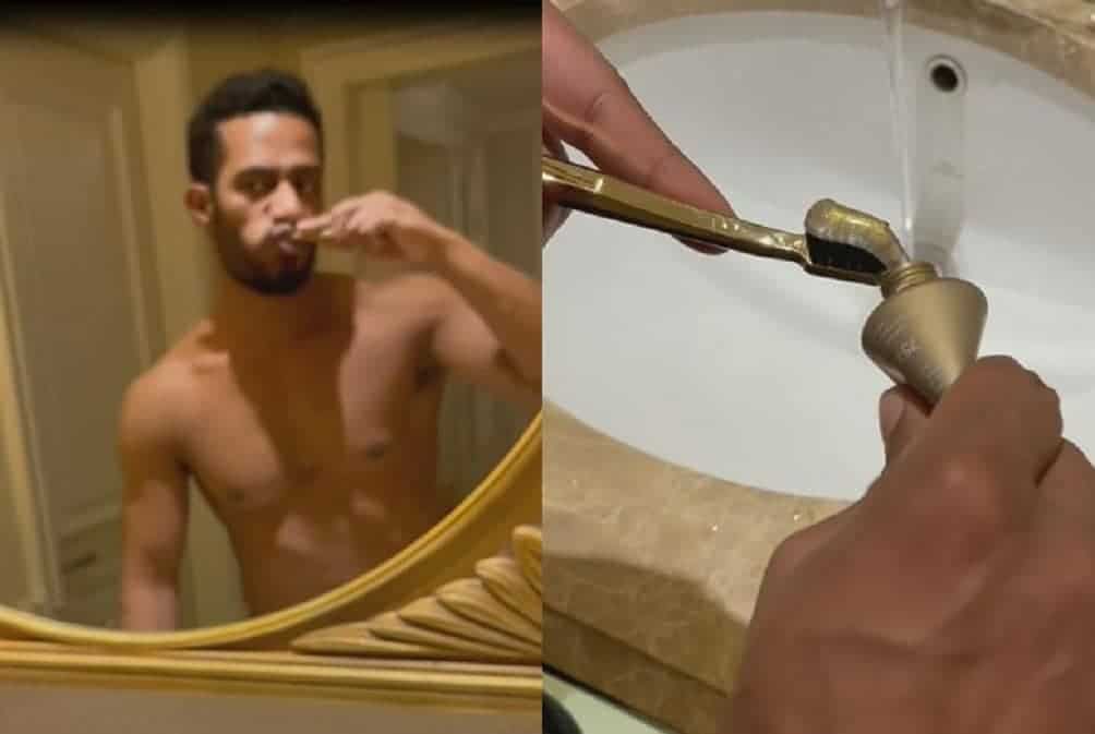 ونشر رمضان فيديو عبر حسابه على “انستجرام”، وهو يغسل أسنانه بمعجون مصنوع من الذهب، ويقف عاري الصدر أمام المرآة.