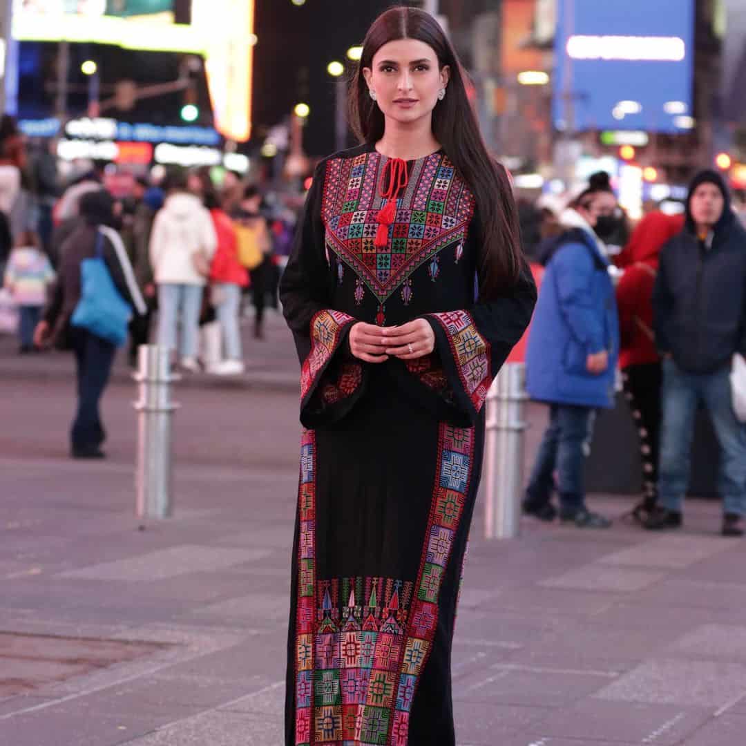 كذلك إعلامية “الرؤيا” راميا الإبراهيم، ارتدت الثوب الذي وصلها. ونشرت الصورة عبر “تويتر” وعقبت: “ضمن السرقة الممنهجة لتراثنا الفلسطيني الاحتلال الإسرائيلي. يقدم التوب الفلسطيني على أنه زي توراتي في مسابقة ملكة جمال الكون 2021