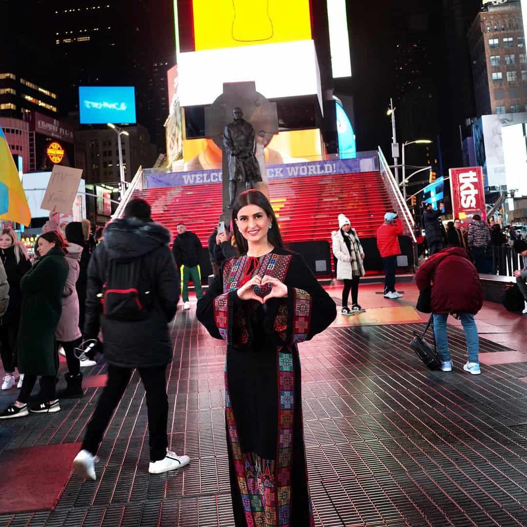 وعقبت الإعلامية ذات الأصول الفلسطينية: “تراثنا مش للسرقة .. واثوابنا رمز حضارة وعراقة وتاريخ …اتشرف بارتداء هذا الثوب الذي حاكته لي امرأة فلسطينية من غزة. تسلم ايديك”.