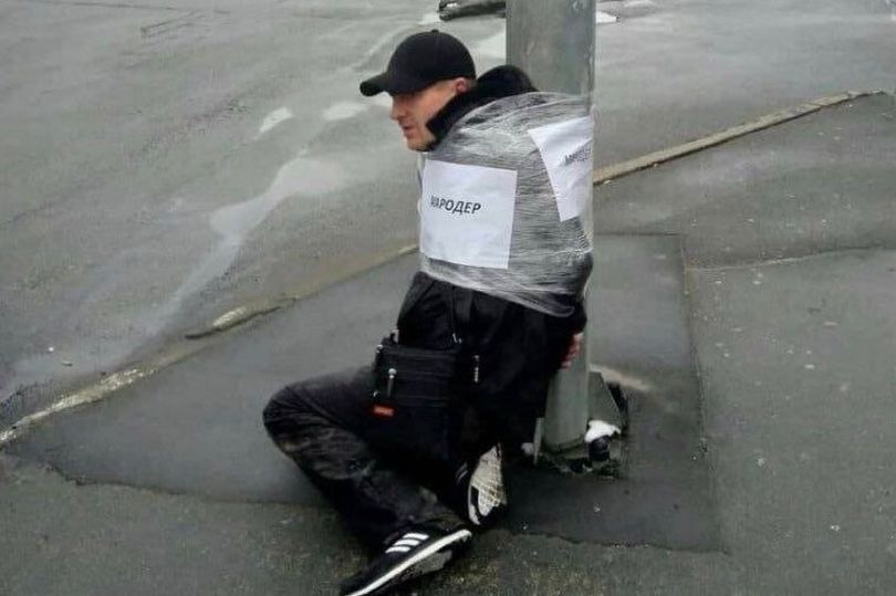 وطن – لجأ الأوكرانيون إلى ربط اللصوص على أعمدة الإنارة وأعمدة الهاتف. بعد أن أفادت وسائل الإعلام المحلية بتصاعد أعمال النهب أثناء الغزو الروسي.