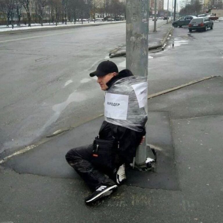 والتقط أحد المستخدمين على تويتر عددًا من الصور لصوص مسجَّلين. قائلاً:  “حيث ينتشر النهب والخروج عن القانون في بعض مناطق أوكرانيا، يحاول السكان المحليون منع اللصوص وقطاع الطرق بأنفسهم”.