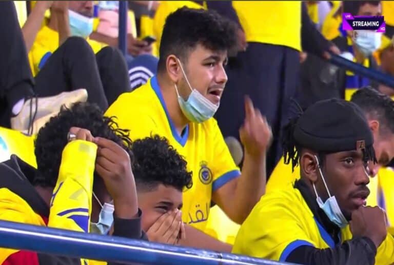 والتقطت عدسات الكاميرا من داخل مدرجات الملعب، أحد مشجعي فريق النصر وهو يبكي بحرقة مع بداية الشوط الثاني من المباراة عقب تأخر فريق النصر بثلاثة أهداف نظيفة أمام منافسه الهلال. في قمة ديريي الجولة ال23 من الدوري السعودي للمحترفين في كرة القدم.