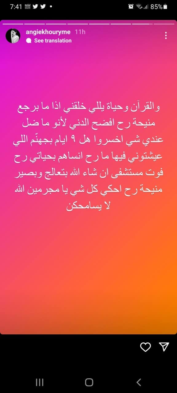 وكتبت إنجي تعقيباً على التقرير، متوعدة: “والقرآن وحياة الله، إذا ما برجع منيحة. راح أفضح الدني”