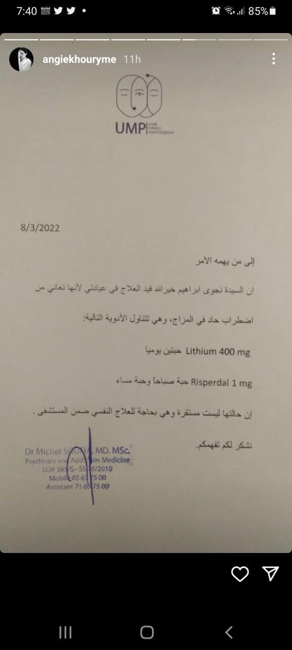 كما كشفت إنجي عن تقرير طبي، يفيد بمعاناتها من مرض نفسي. وهو اضطراب حاد في المزاج.