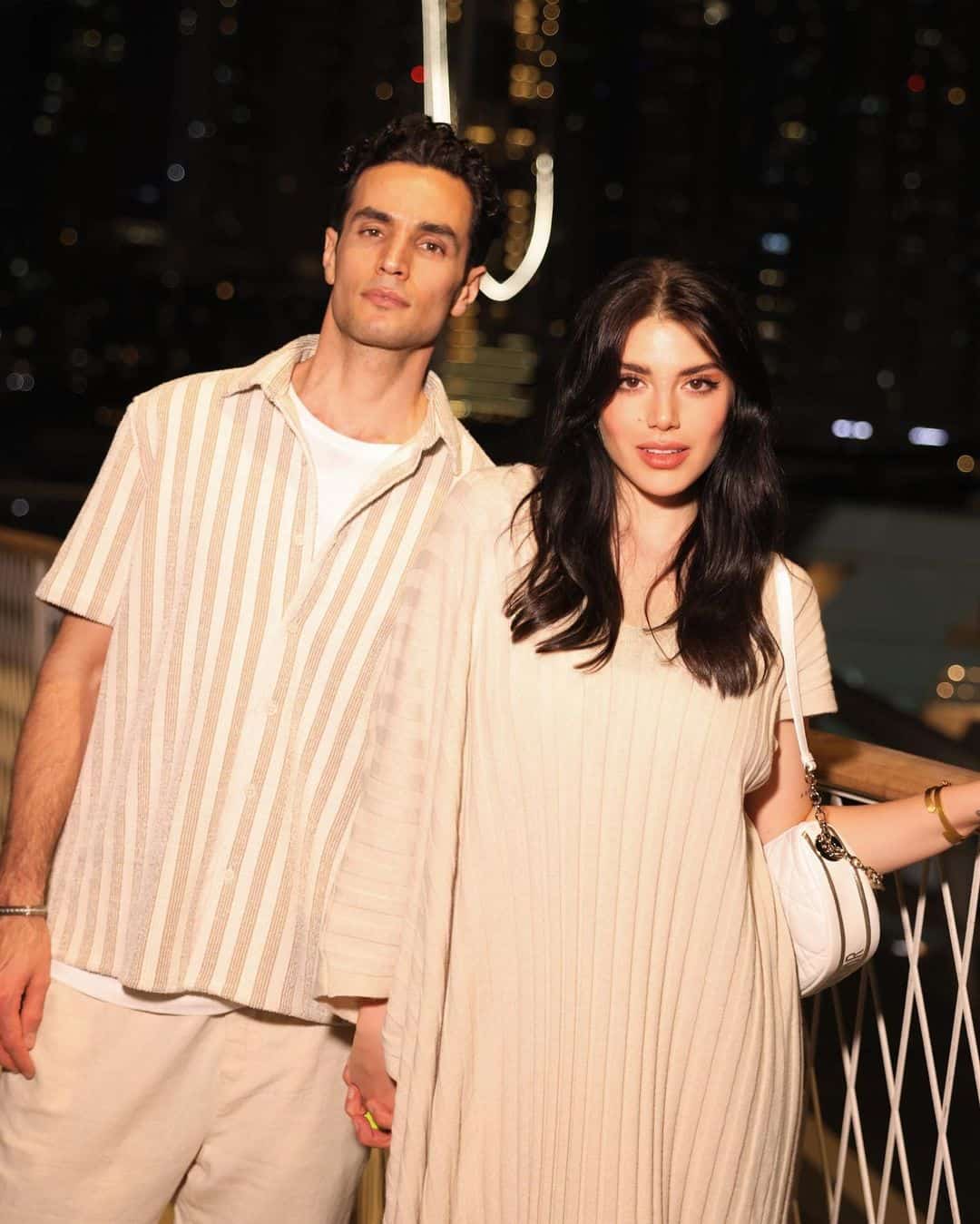وظهرت سينتيا بالصور التي نشرتها عبر “انستجرام” وهي متشابكة اليد بوضعية رومانسية مع آدم. وترتدي فستاناً باللون البيج، بينما يرتدي حبيبها نفس الألوان.