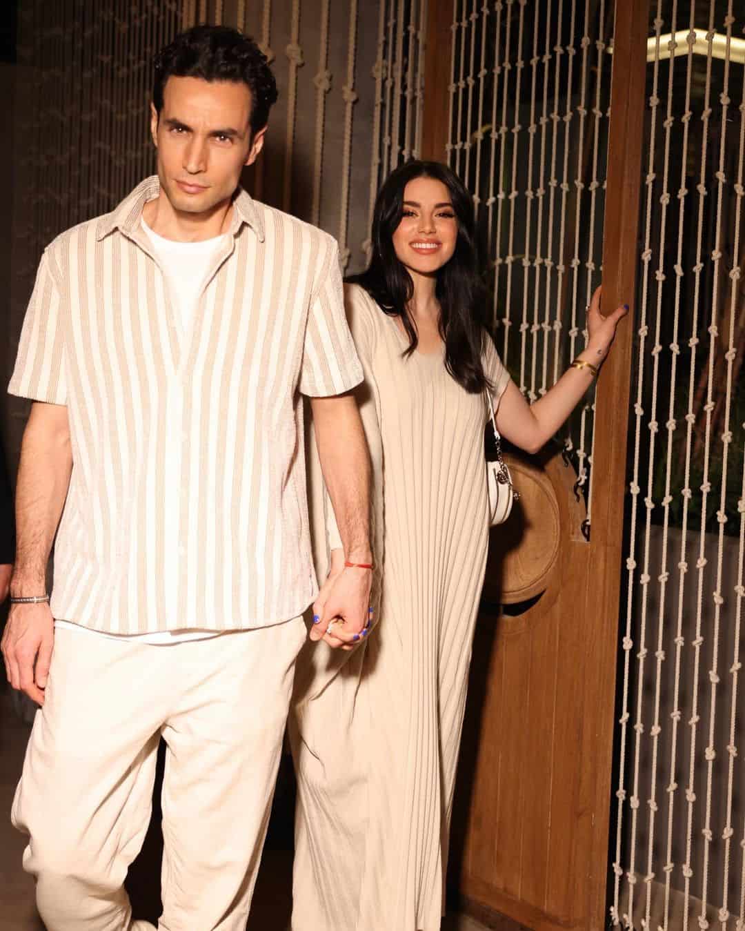 وظهرت سينتيا بالصور التي نشرتها عبر “انستجرام” وهي متشابكة اليد بوضعية رومانسية مع آدم. وترتدي فستاناً باللون البيج، بينما يرتدي حبيبها نفس الألوان.