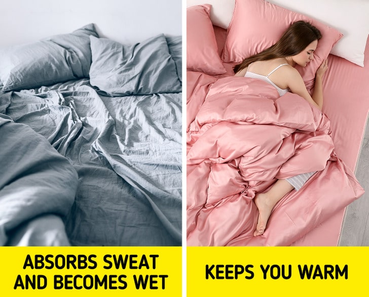 في الواقع، يمتص القطن العرق من الشعر والجلد بفاعلية، مما يستلزم غسله كثيرًا. إلى جانب ذلك، يستغرق جفافه وقتًا طويلاً، لذلك ينصح باستخدام أغطية من الكتان التي تمتص العرق.