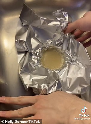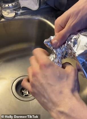 قامت هولي أولاً بأخذ ورقة من الألومنيوم وقامت بوضعها في حوض مطبخها. مع التأكد من أن طريقة الوضع تناسب شكل مصرفها.