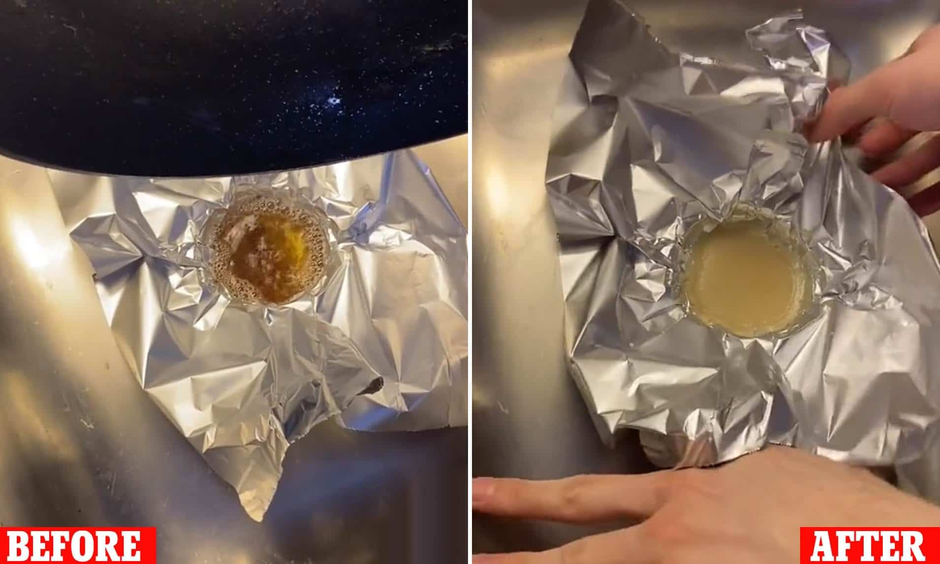 بعد أن قامت بطهي لحم الخنزير المقدد، قامت بسكب الزيت المتبقي من المقلاة في ورق الألمنيوم. وسكبت الزيت خاصة في المنطقة الموجودة في الصرف.