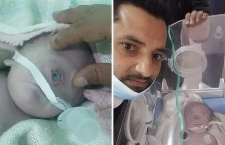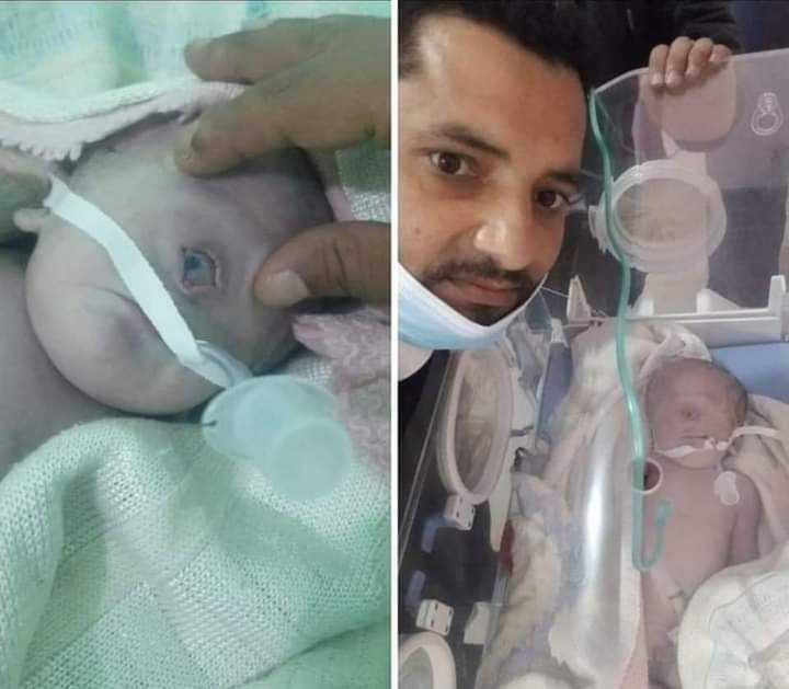 وتابع أنه أول مرة يشاهد مثل هذه الحالة، لكنها موجودة في كتب الطب. مضيفا أن الحالة تكون لطفل بعين واحدة وتجويف عيني واحد وعصب بصري واحد.