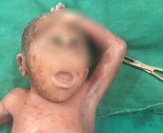 وأشار إلى أن السيدة لديها ولدان، وفى الطفل الثالث تلاحظ وجود تشوهات، ما استلزم ضرورة إجراء ولادة قيصرية له. وتلاحظ وجود تشوهات الرئتين، والقلب، وبعين واحدة تحمل “حدقتين” أو ما يسمى بسواد العين.