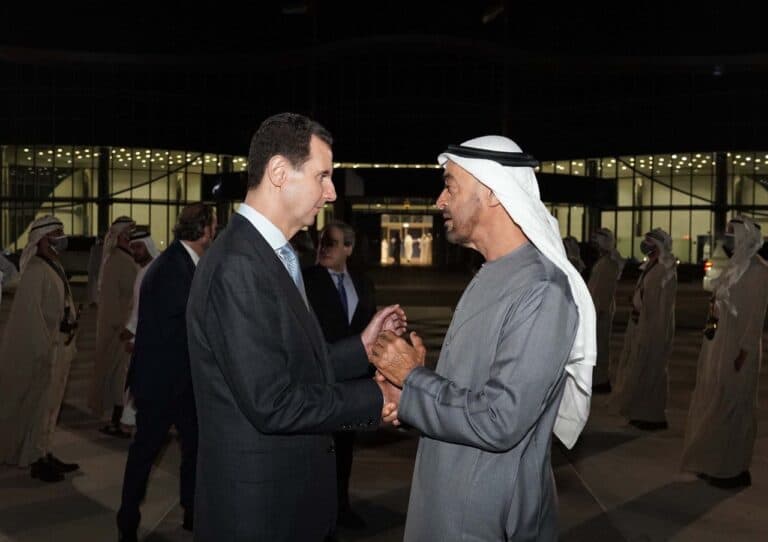 وطن – أثارت زيارة رئيس النظام السوري بشار الأسد، الجمعة، إلى الإمارات، ولقائه ولي عهد أبوظبي محمد بن زايد، وحاكم دبي محمد بن راشد، غضباً واسعاً بين النشطاء والكُتّاب، واصفين اللقاء بأنه “لقاء ثنائي الثورة المضادة” .