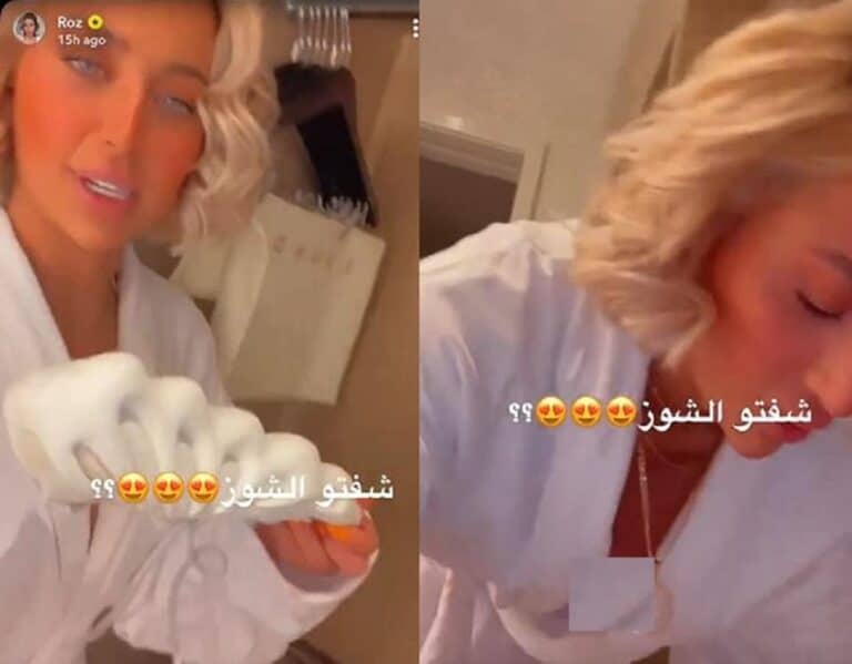 وحين انحنت روز لإحضار الحذاء، أثناء البث المباشر عبر “سناب شات”، ظهر صدرها بشكل واضح من تحت روب الاستحمام.