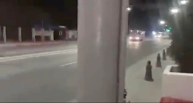 كما شوهدت ما لا يقل عن ثلاث حافلات خضراء عليها علامات “V” تمر عبر شارع خالي.