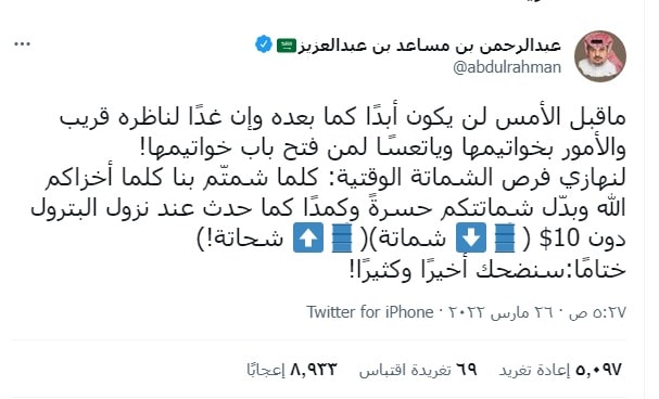 وأضاف الأمير عبدالرحمن بن مساعد قائلا: “لنهازي فرص الشماتة الوقتية: كلما شمتّم بنا كلما أخزاكم الله وبدّل شماتتكم حسرةً وكمدًا كما حدث عند نزول البترول دون( 10 $ شماتة)( ارتفاع شحاتة)!”.