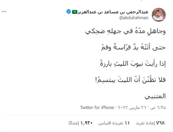 وتابع “ابن مساعد” تهديداته في تغريدة أخرى مذكرا بأبيات شعرية لـ”المتنبي” قائلا: “وجاهلٍ مدّهُ في جهلهِ ضحِكي.. حتى أتَتْهُ يدٌ فرّاسةٌ وفمُ ..إذا رأيتَ نيوبَ الليثِ بارزةً.. فلا تظُنّنَ أنّ الليثَ يبتسِمُ!”.