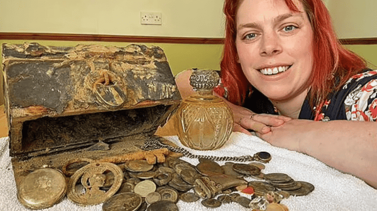 وقد عثرت جيني، التي تعمل سكرتيرة طبية في إحدى العيادات، على حوالي 100 قطعة نقدية قديمة وجواهر وساعة جيب قديمة صدئة بالإضافة إلى خاتم فضة داخل الصندوق.