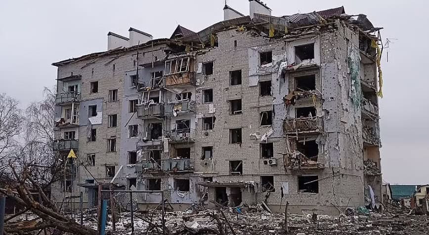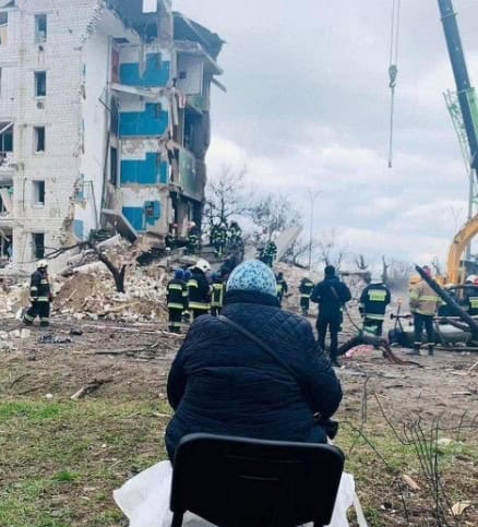 وأظهرت الصورة المرأة جالسة على كرسي بينما يقوم رجال الإنقاذ بتمشيط بحث يائس عن ناجين. وفقًا للسكان المحليين ، أوقف الروس جهود الإنقاذ ، مما ترك الناس مدفونين تحت الأنقاض لمدة أسبوع قبل انسحاب قوات بوتين في النهاية.