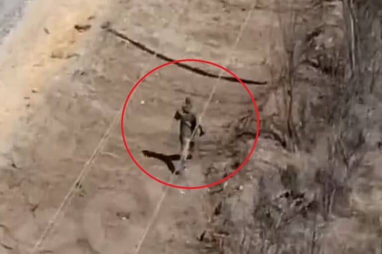 وقالت صحيفة “ديلي ميل” إنه يمكن رؤيته وهو يتفقد كتفه وهو يركض على الحافة المغبرة بجانب الطريق. مدركًا بوضوح أن الطائرة بدون طيار تلاحقه.