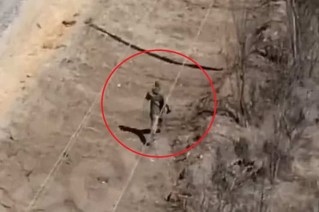 وأظهر الفيديو الذي التقط من خلال طائرة مسيرة أخرى مدى الرعب الذي عاشه الجندي الروسي، حيث كان ينظر للسماء كل عدة ثواني أثناء هربه.