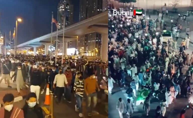 وتداول الناشطون عبر مواقع التواصل الاجتماعي مجموعة من الفيديوهات تظهر أعدادا كبيرة من أبناء الجالية الباكستانية وهم يجوبون الشوارع في دبي مطلقين عبارات الغضب ضد الإطاحة بعمران خان.