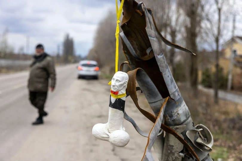 وفي صورة التي نشرت على موقع التواصل وأرودتها صحيفة “ديلي ستار”، يبدو أن الرئيس الروسي مرسوم على قالب جبس على شكل “عضو ذكري” يتدلى من عمود عند نقطة تفتيش في طريقه إلى العاصمة الأوكرانية كييف.