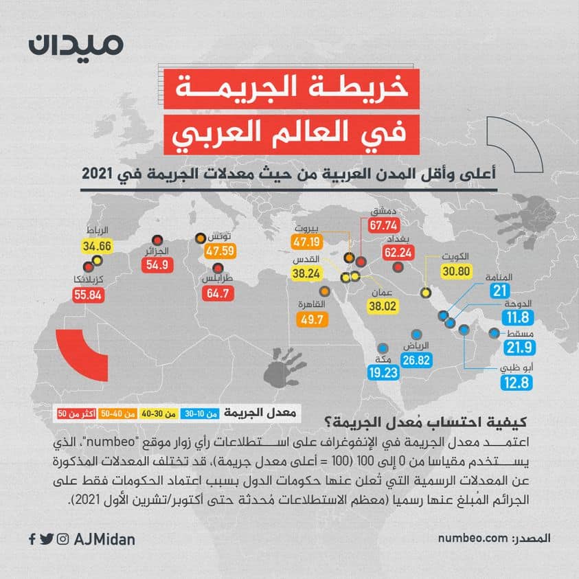 واعتمد معدل الجريمة على استطلاعات رأي زوار موقع NUMBEO الذي يستخدم مقياساً من 0 إلى 100 ( 100 أعلى معدل جريمة).