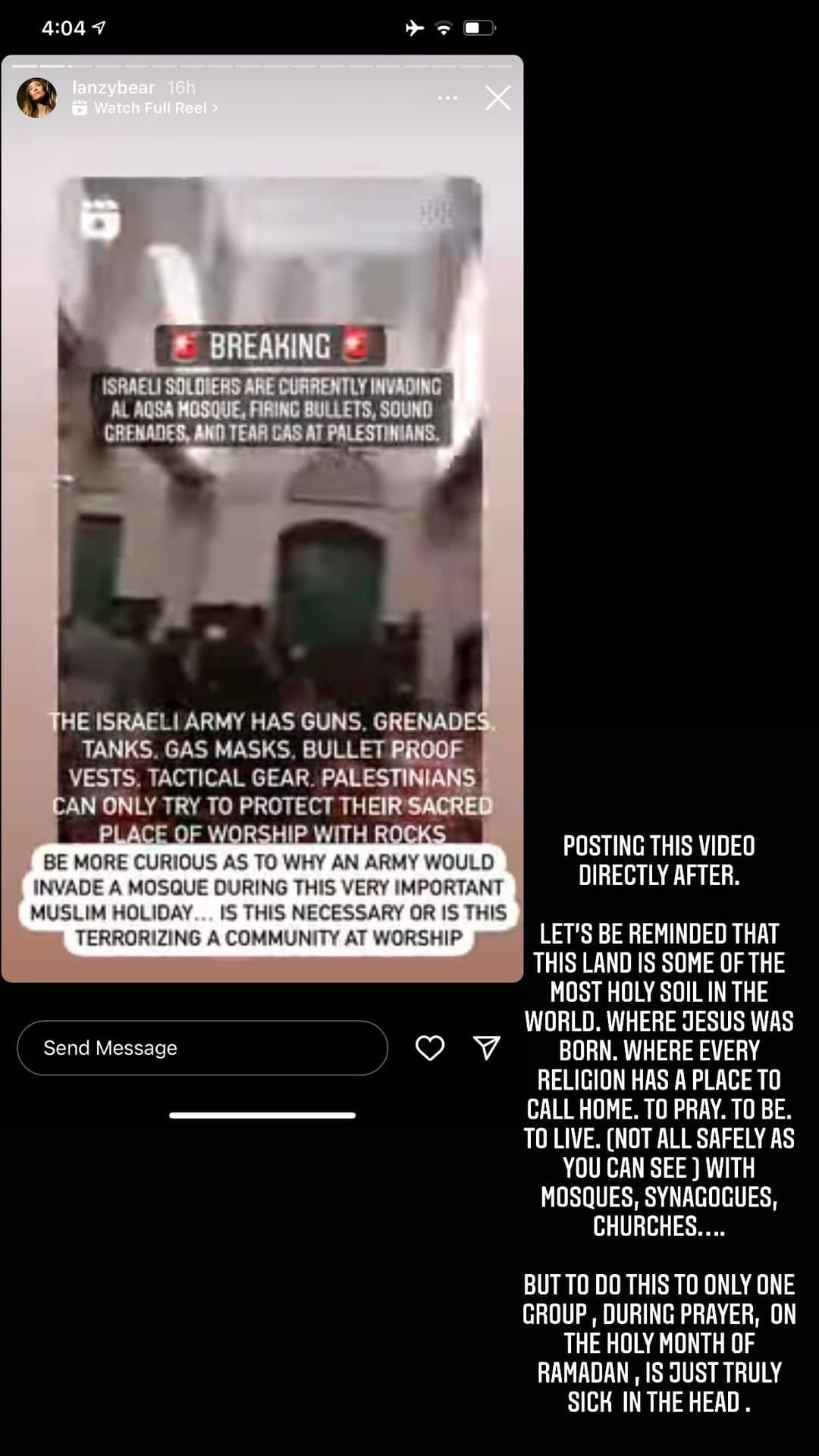 ونشرت بيلا حديد العديد من الصور والفيديوهات التي توثق اعتداءات جنود الاحتلال الإسرائيلي بحق المصليين في الأقصى مطالبة منظمات حقوق الإنسان بالتدخل.
