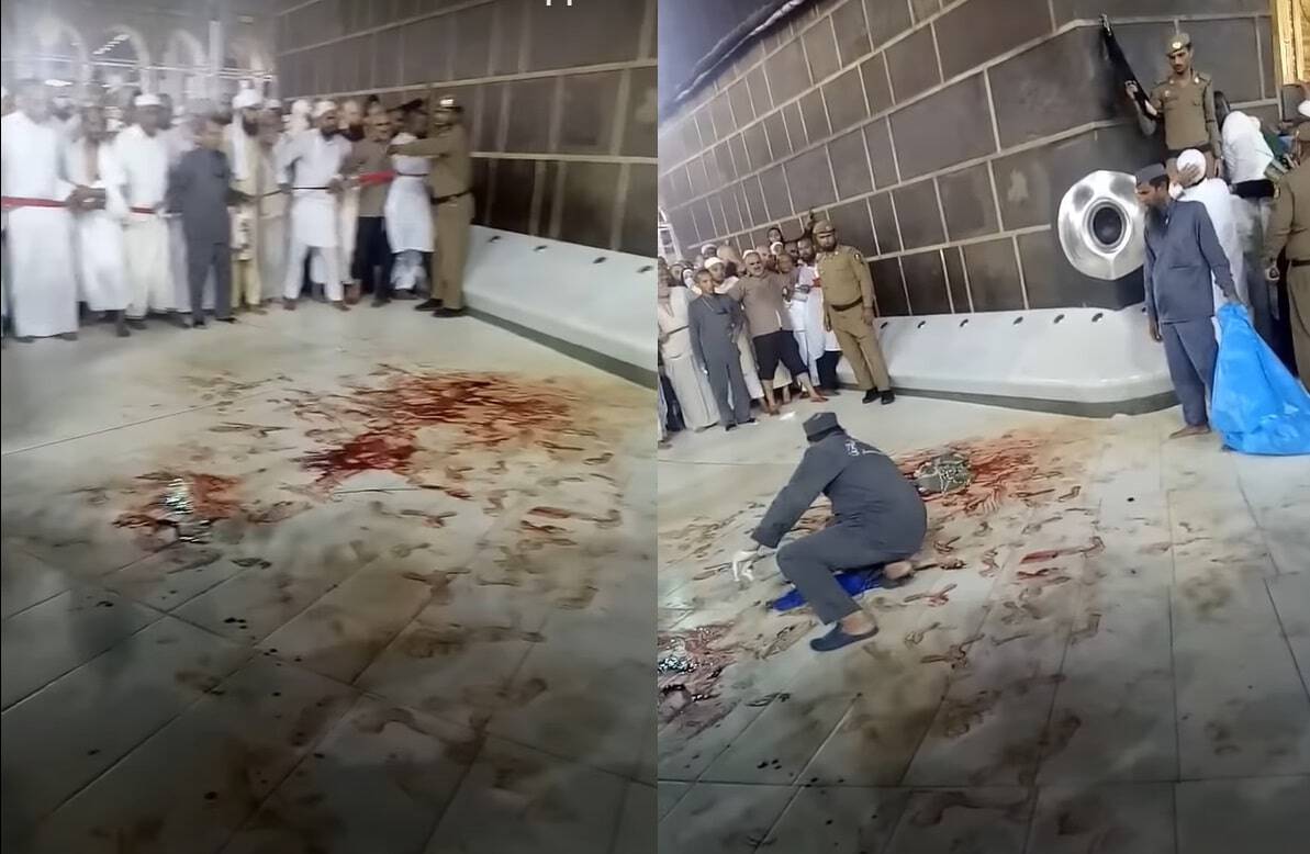 ويظهر المقطع بقعة من دماء على الأرض في الحرم المكي بجوار الكعبة، ويتجمع حولها عدد من الحجاج أو المعتمرين وعناصر الأمن.