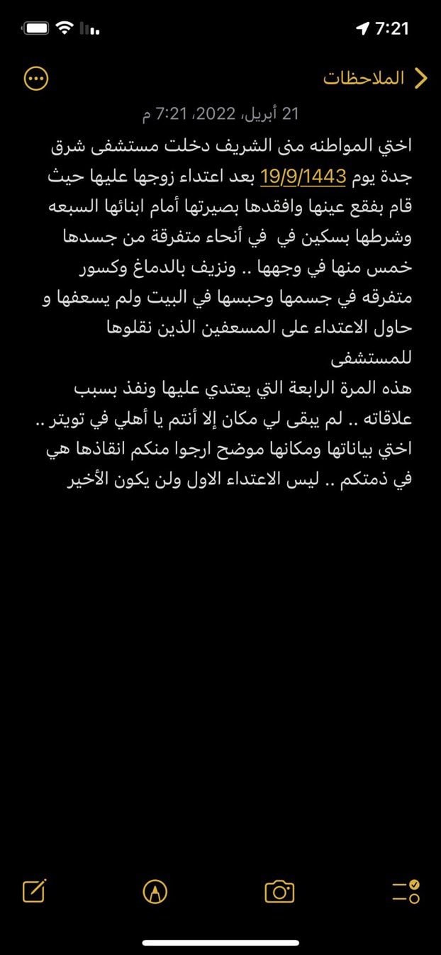 وكتبت شقيقة معنفة جدة: ” أختي المواطنة منى الشريف دخلت مستشفى شرق جدة يوم 19/9/1443 بعد اعتداء زوجها عليها. حيث قام بفقع عينها وأفقدها بصيرتها أمام أبنائها السبعة”.