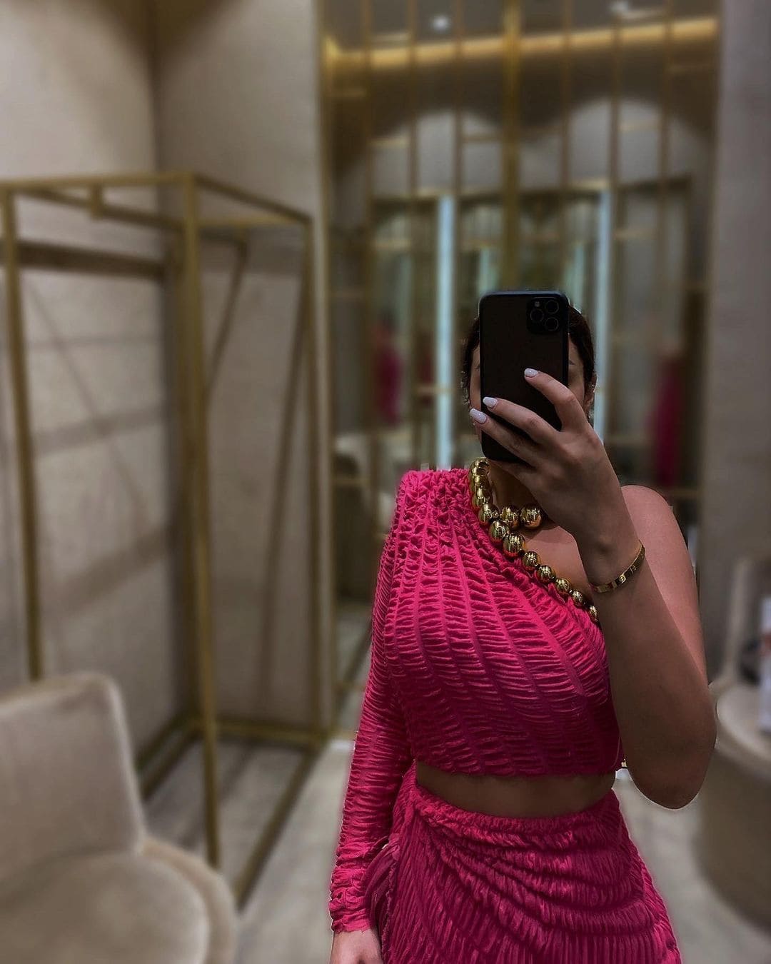 وظهرت زينب فياض بالصور التي نشرتها عبر حسابها على “انستجرام”، وهي ترتدي فستاناً باللون الفوشي، أوف شولدر من ناحية واحدة، ومكشوفاً لدى منطقة البطن.