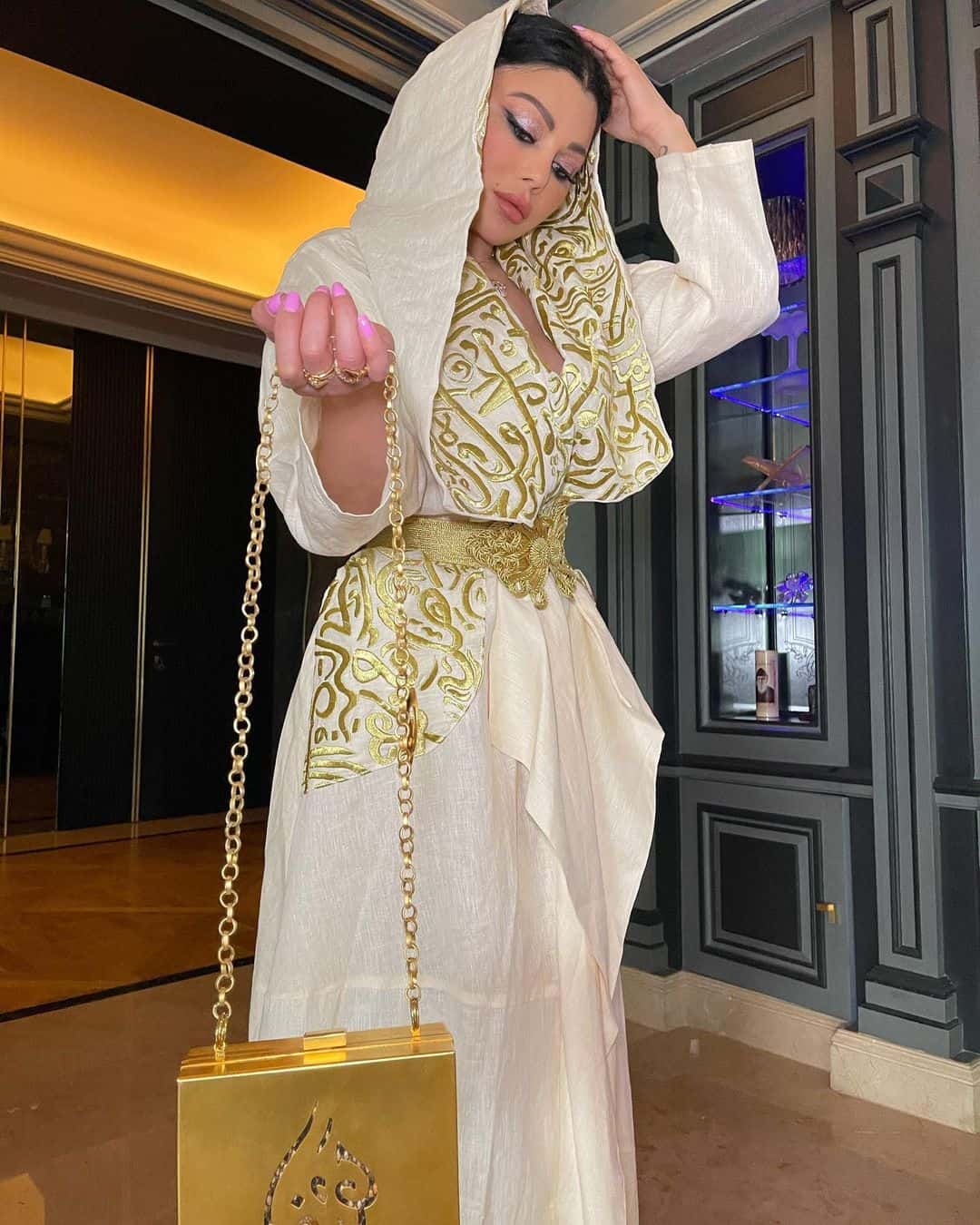 ومؤخراً ظهرت هيفاء وهبي بعباءة باللون البيج مطرزة بالذهبي.