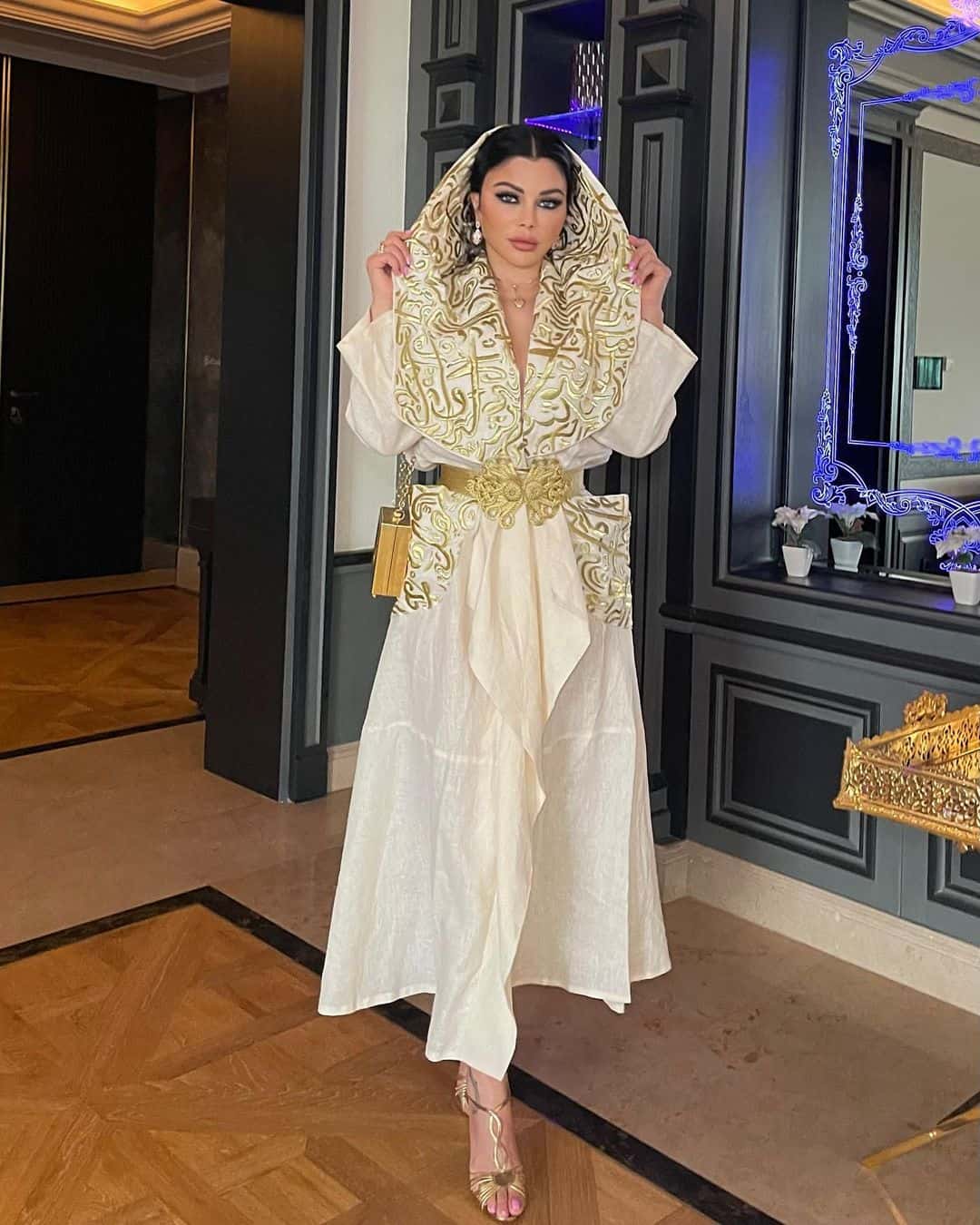 ومؤخراً ظهرت هيفاء وهبي بعباءة باللون البيج مطرزة بالذهبي.