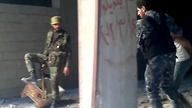وقالت الصحيفة إن اللقطات كنت غير واضحة في البداية ، قبل أن تقترب من حفرة محفورة حديثًا في الأرض بين قذائف مبنيين مثقوبة بالرصاص. جثا ضابط مخابرات يعرفه على ركبتيه بالقرب من حافة الحفرة مرتديا زيا عسكريا وقبعة صيد ، وهو يلوح ببندقية هجومية ويصدر أوامر بالنباح.