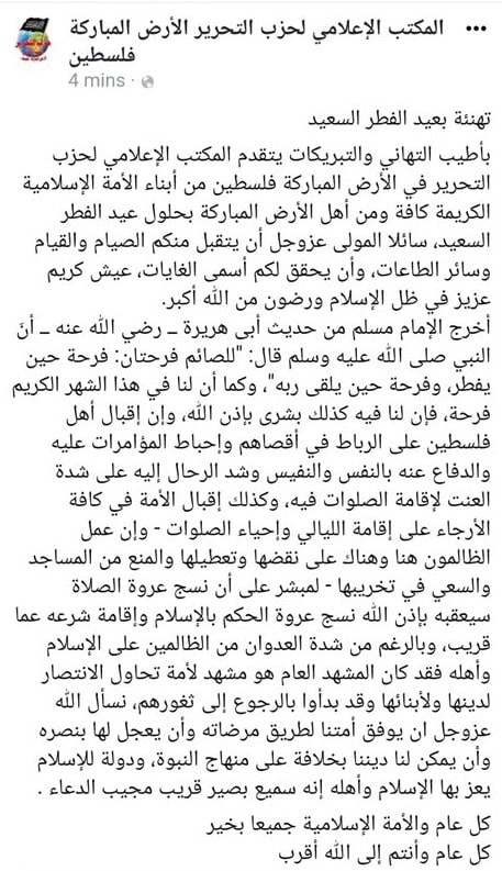 وقال حزب التحرير في بيان على فيسبوك صدر عن المهندس صلاح الدين عضاضة مدير المكتب الإعلامي المركزي للحزب إنّه: “بعد تحرّي هلال شوال في هذه الليلة المباركة ليلة الأحد فقد ثبتَت رؤية الهلال رؤية شرعية وذلك في بعض بلاد المسلمين. وعليه فإنّ الأحد هو أوّل أيّام شهرِ شوال وهو أول أيام عيد الفطر المبارك”.