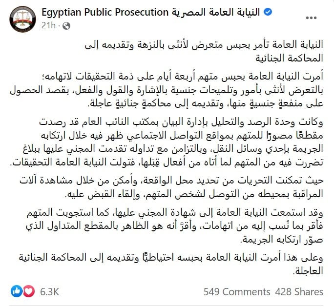 وبحسب بيان رصدته (وطن) على صفحة النيابة العامة المصرية بفيسبوك، فقد أمرت النيابة بحبس متهم أربعة أيام على ذمة التحقيقات لاتهامه؛ بالتعرض لأنثى بأمور وتلميحات جنسية بالإشارة والقول والفعل؛ وذلك بقصد الحصول على منفعةٍ جنسيةٍ منها، وتقديمه إلى محاكمةٍ جنائيةٍ عاجلة.