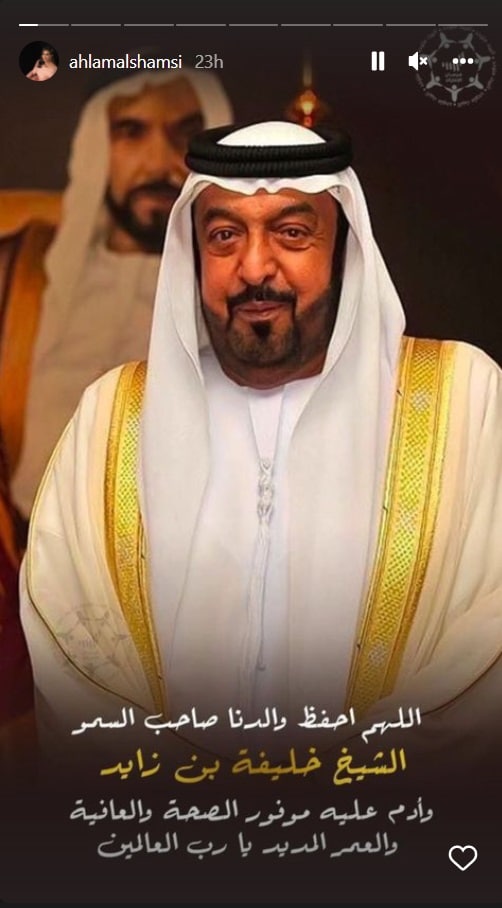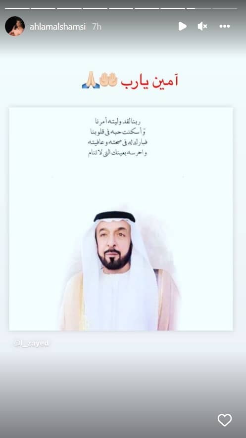 ونشرت أحلام عبر “ستوري” حسابها الرسميّ في “انستغرام”، كما رصدت وطن، عدة صور للشيخ خليفة تحمل دعاءً له، خاصةً وأنها تأزمنت مع تصدر وسم باسم “خليفة بن زايد” التريند الإماراتي بتويتر منذ الأمس، مع دعوات كبيرة له بالشفاء.