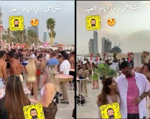 ووفقا للفيديو المتداول ونشره حساب “مشاهير وخرابيط” ورصدته “وطن”، فقد وثق الفيديو حفلا صاخبا مختلطا على أحد الشواطئ في الإمارة المنفتحة. حيث ظهر غالبية مرتادي الشاطىء وهم يرقصون على أنغام الـ ” دي جي” شبه عرايا.