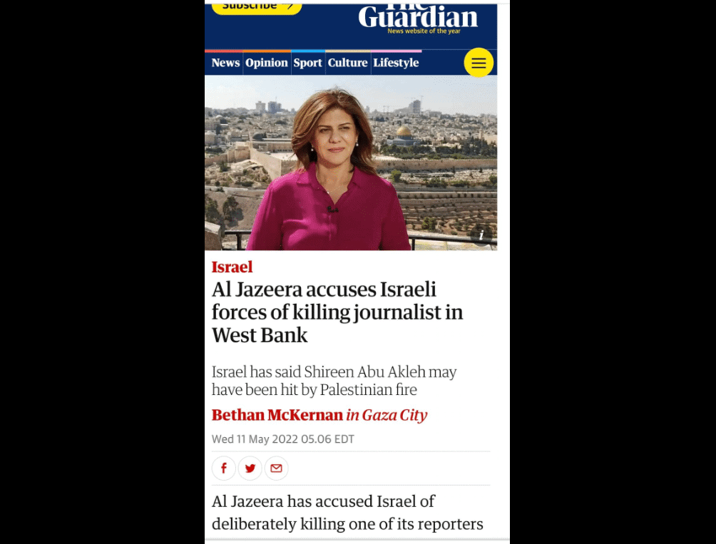 بينما صدرت صحيفة “الجارديان” البريطانية تغطيتها بالرواية الإسرائيلية التي تتهم الفلسطينيين بقتل شيرين أبو عاقلة.